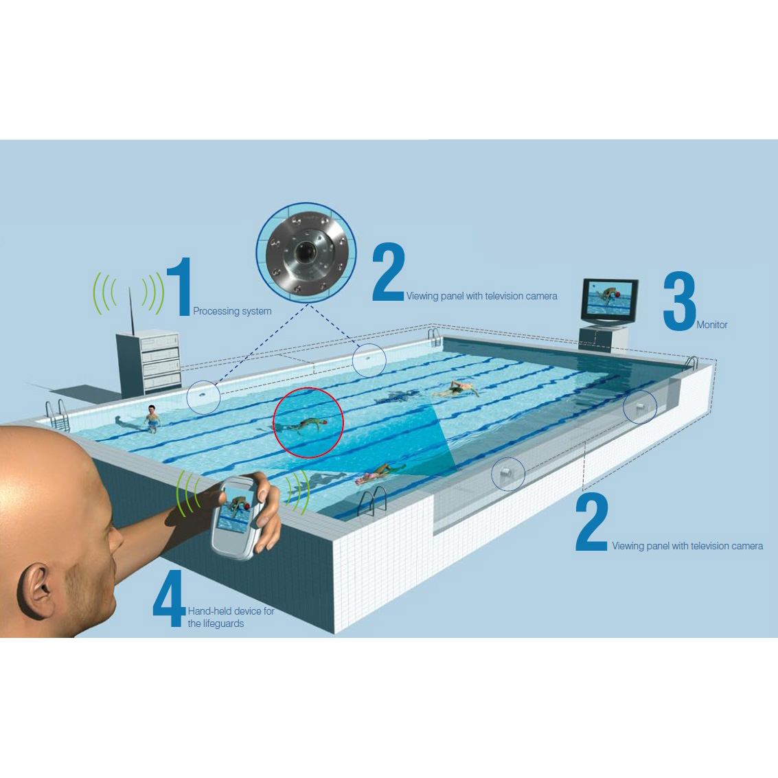 Установленные в бассейне видеокамеры исследуют пространство бассейна, изображение анализируется в режиме реального времени с помощью специального программного обеспечения.