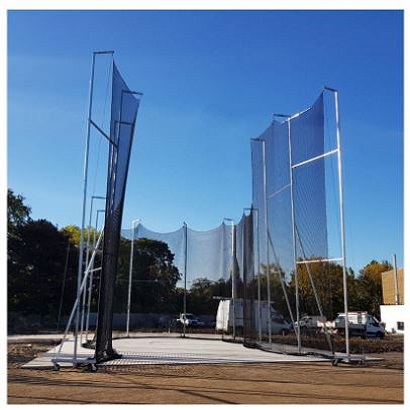 Стаканного типа установки. Усиленная, надежная конструкция из стального каркаса. Сетки (изготовлены из полипропилена диаметром 5 мм с защитой от гниения, ячейки 40х40 мм, крепкие, черного цвета, соответствуют стандарту EN-1263-1) установлены в «плавающем» положении, чтобы исключить опасность рикошета/отскока снаряда в атлета или за пределы зоны сектора метания, согласно правилам IAAF. Сетка легко опускается/поднимается благодаря нейлоновым роликам. Сетки и стаканы для установки входят в комплект. Производство EU.