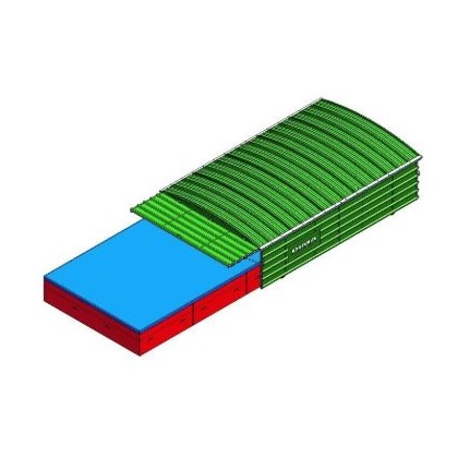 Защитный ангар модели International: Размеры 6,4x4,4 м, фиксированные/поворотные колеса, состоит из двух элементов.