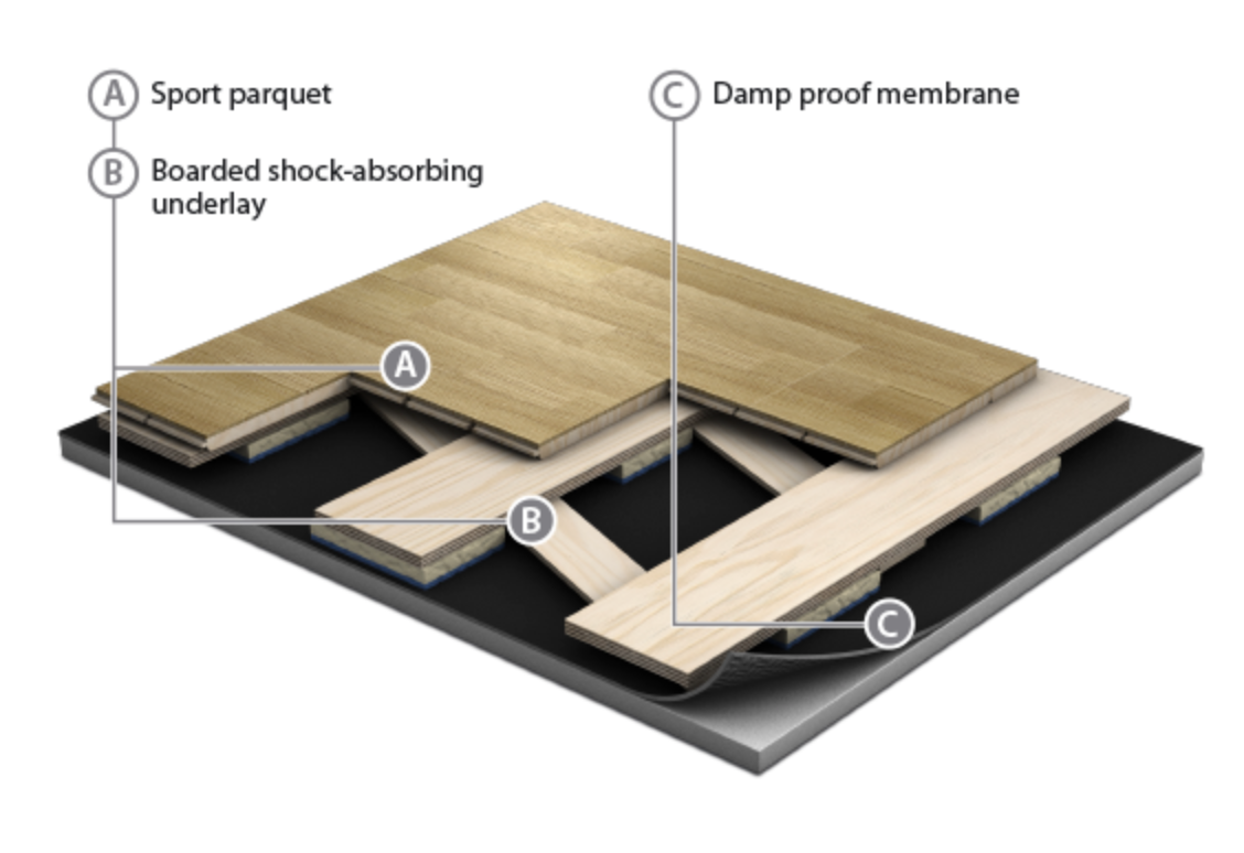 Система состоит из влагоотводящей подкладки, амортизационной подкладки и верхней части в виде спортивного паркета.