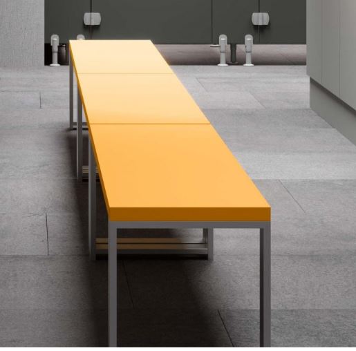 Каркас выполнен из стального профиля прямоугольного сечения с эпоксидным порошковым покрытием, сидениье с меламиновым покрытием (толщиной 18 мм). Сиденье также доступно из ламината HPL (толщиной 14 мм).