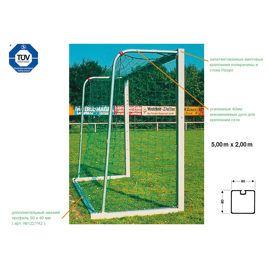 Оснащены боковыми рамами, скобами для крепления сетки, рамой основания с круглыми трубами и безопасными креплениями для сетки. Перекладина и стойки ворот изготовлены из алюминиевого профиля 80х80 мм. Производство EU.