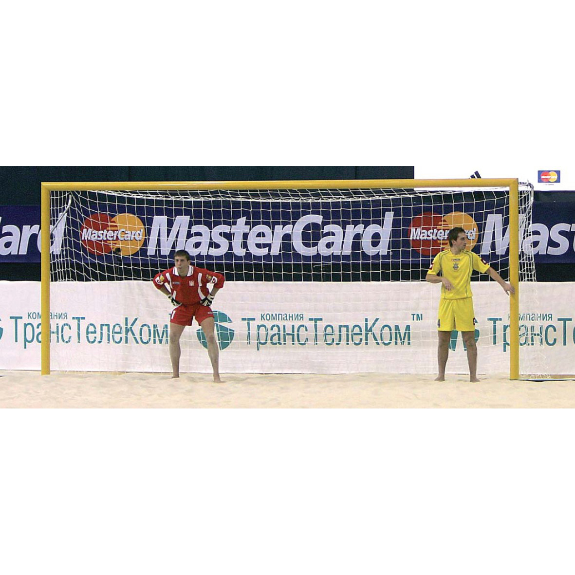 Изготовлены из специальных профилей 120/100 мм, окрашены желтой краской. Конструкция схожа с конструкцией ворот стаканного типа установки, единственные различия – размер ворот и специальные закладные стаканы для установки ворот. Закладные стаканы просто монтируются в песок. Во время использования рекомендовано утяжелять низ сетки. Оснащены держателями сетки из алюминиевой трубы диаметром 30 мм. Производство EU.