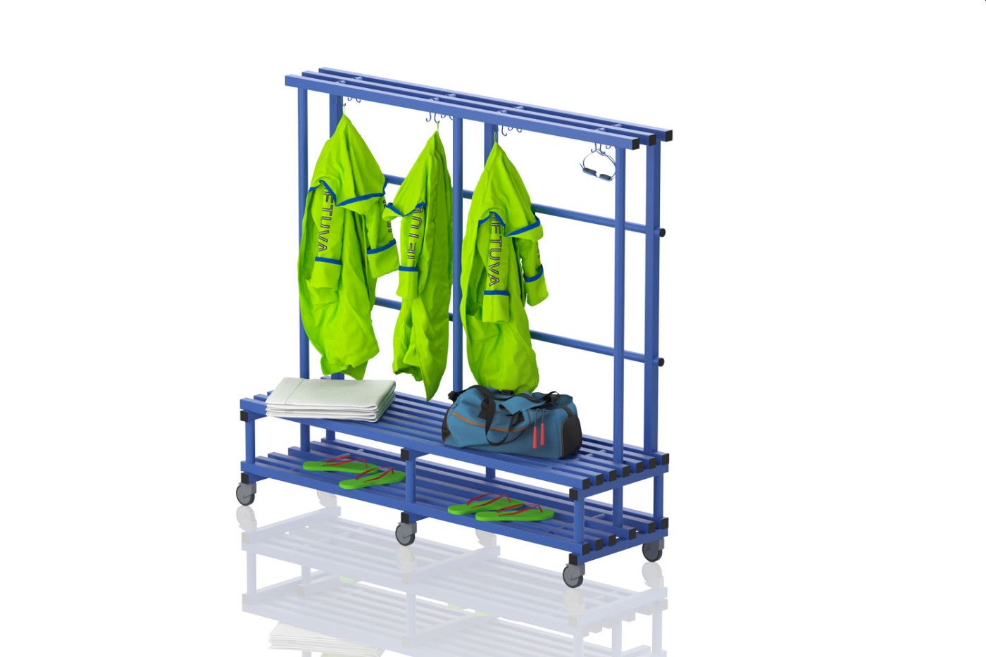 Оснащена 8 двойными вешалками, скамейкой с полкой снизу и верхней полкой.