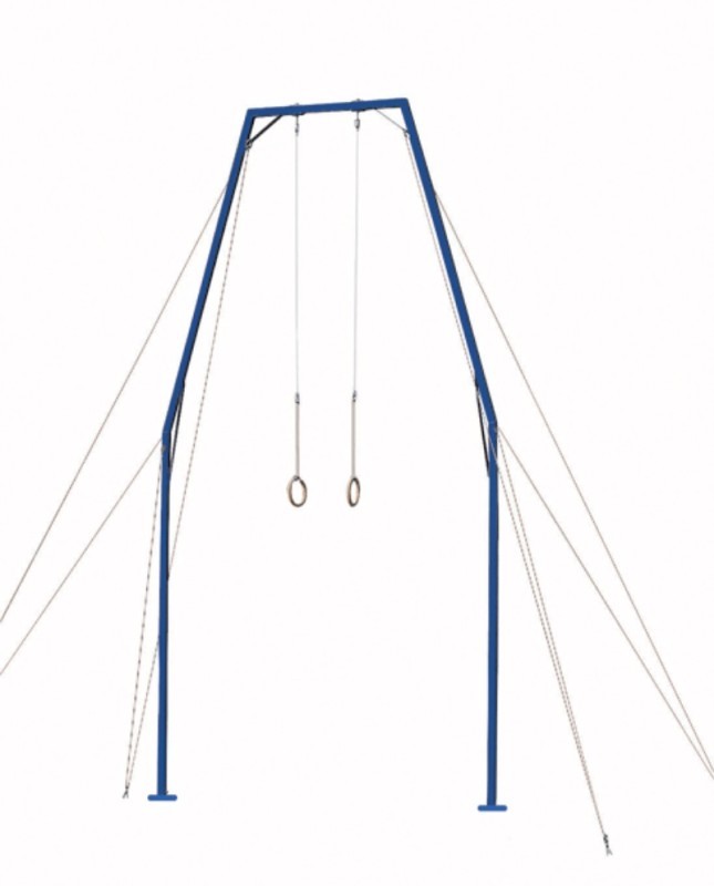 Конструкция из окрашенной стали для профессиональных упражнений с гимнастическими кольцами. Изготовлен из нескольких элементов, легко собирается и демонтируется. Поставляется в комплекте с крепежом, растяжками для крепления и анкерными креплениями к полу (кольца и стропы в комплект не входят). Производство EU.