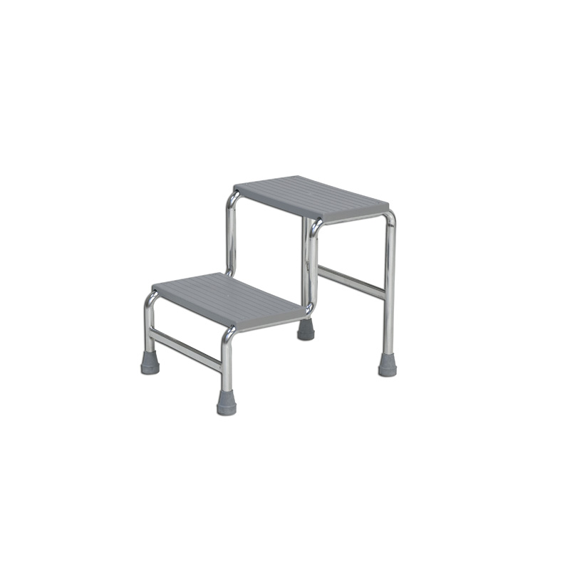 Изготовлена из хромированной стали, имеет 2 пластиковые ступеньки и резиновые накладки на опорах.