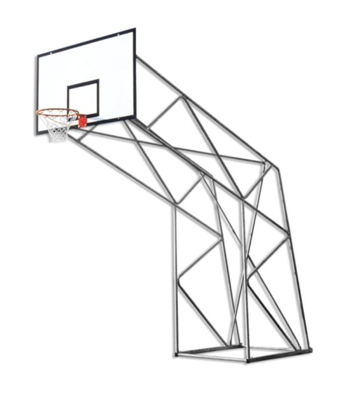 Крепится к основанию. Конструкция из стальных гальванизированных профилей диаметром 40 мм с выносом щита 225 см. Оснащена баскетбольным щитом из hpl с габаритами: 180х105 см и толщиной 10 мм, щит установлен на стальной гальванизированной раме. В комплект входят: фиксированное стальное кольцо и нейлоновая сетка. Производство EU.