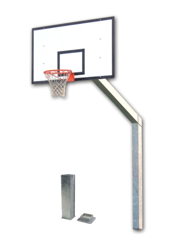 Конструкция из гальванизированного стального профиля 150х150х3 мм, полностью сварная. Поставляется с закладным стаканом и крышкой. Оснащена баскетбольным щитом из hpl с габаритами: 180х105 см и толщиной 10 мм, щит установлен на стальной гальванизированной раме со стабилизирующей штангой соединенной с основной рамой. В комплект входят: фиксированное стальное кольцо и нейлоновая сетка. Производство EU.