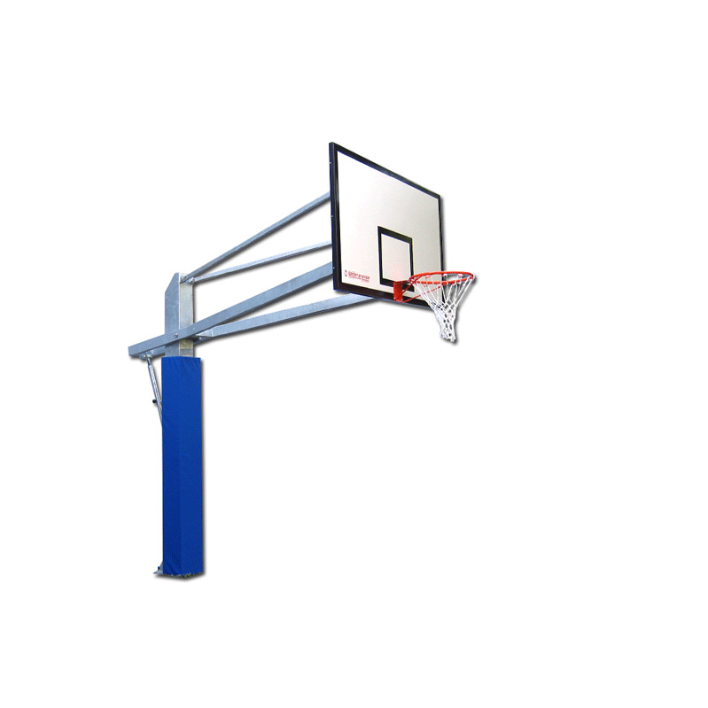 Регулируемая по высоте. Вертикальная конструкция из гальванизированной стали с сечением 200х200х3 мм, выполнена из 4 трубообразных профилей. Поставляется с закладным стаканом и крышкой. Оснащена баскетбольным щитом из hpl толщиной 10 мм, щит установлен на стальной гальванизированной раме со стабилизирующей штангой соединенной с выносной рамой. В комплект входят: фиксированное стальное кольцо и нейлоновая сетка. Механическое устройство для регулировки высоты стойки под баскетбольные и мини-бскетбольные стандарты (так же можно устанавливать другую высоту). Производство EU.