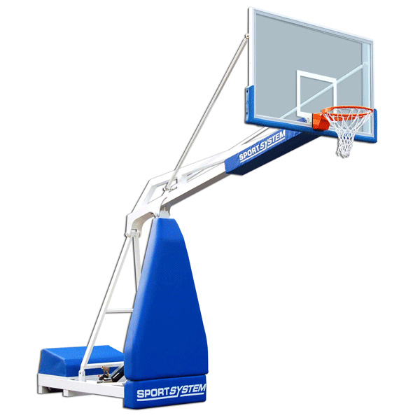 Конструкция из стали в порошковой окраске с выносом щита 225 см. Гидравлическое устройство с ручным насосом, позволяющие приводить стойку из положения хранения в положение игры и наоборот. Телескопическая штанга, наложенная на цилиндр фиксирует щит на необходимой высоте, согласно стандартам баскетбола и мини-баскетбола. Легко перемещается по полу с помощью 4-х колес, которые не оставляют следов, 2 неповоротных колеса в передней части и 2 поворотных колеса в задней части базы, колеса автоматически поднимаются и опускаются в зависимости от положения стойки. В комплект входит противовес с протектором, расположенный в задней части базы стойки. Передние протекторы стойки покрыты синтетическим легкомоющимся материалом. Протекторы закрывают стрелу выноса на 100 см. Оснащена щитом из закаленного стекла толщиной 12 мм с протектором, амортизационным кольцом и сеткой. Производство EU.