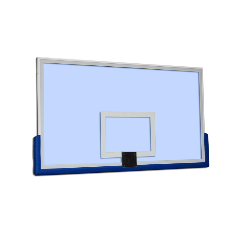 Щит изготовлен из закаленного стекла с защитным покрытием, установленного в стальную раму, с вырезом под установку кольца. В комплект входит полиуретановый протектор U-образной формы, который крепится болтами к раме щита. Оснащен светодиоидной лентой красного цвета для подключения к табло времени атаки (24 сек.) Производство EU.