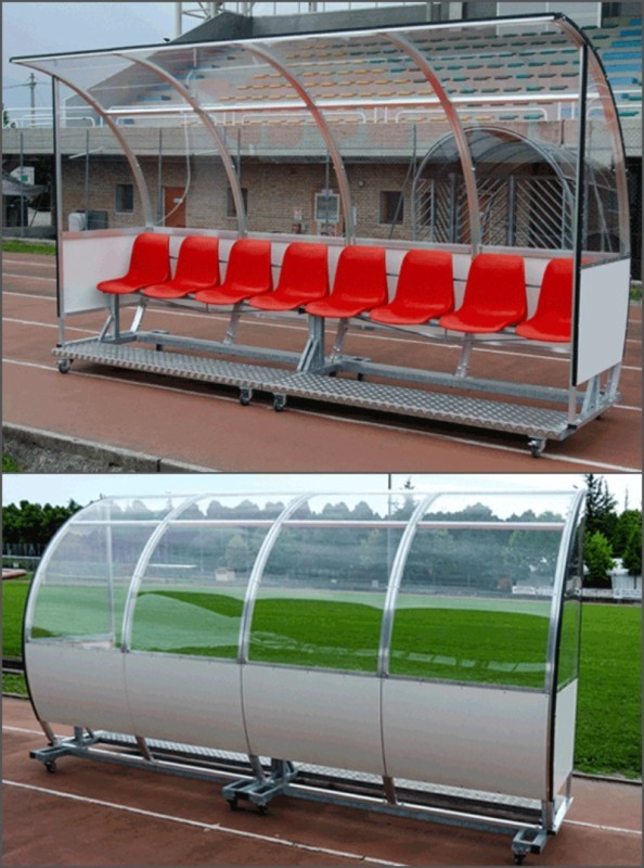 Высота 165 см. Конструкция из гальванизированной стали, прозрачные поликарбонатные панели толщиной 3 мм, полипропиленовые сиденья, с верхними протекторами. Цена за метр. Производство EU.
