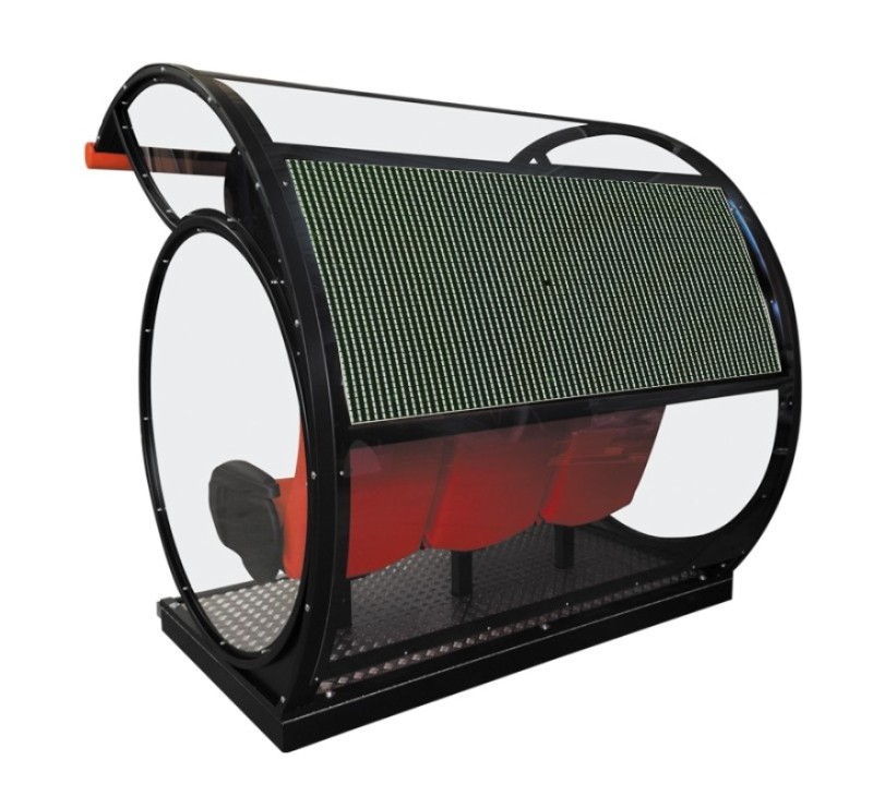 Высота 165 см. Конструкция из гальванизированной стали, прозрачные поликарбонатные панели толщиной 3 мм, полипропиленовые сиденья, с верхними протекторами. Цена за метр. Производство EU.