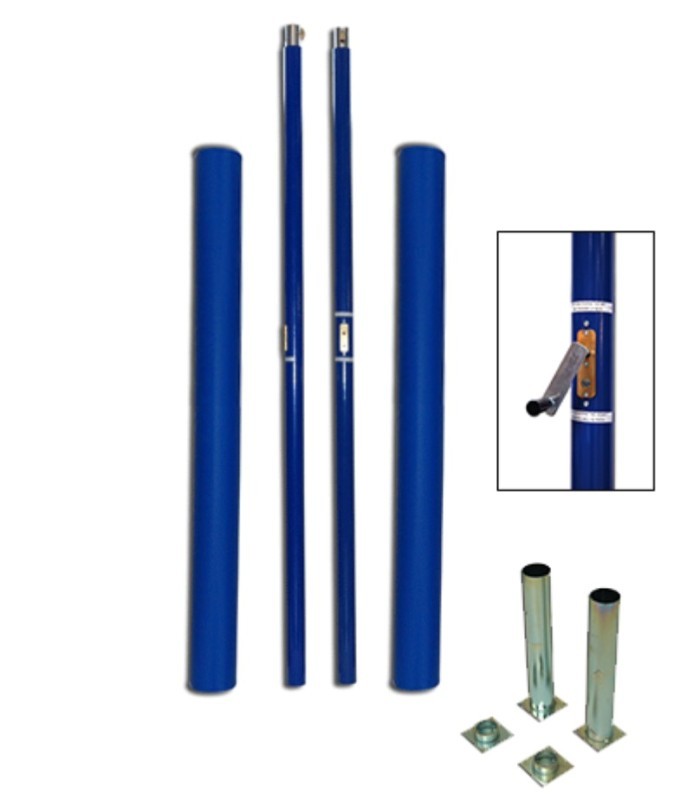 Стойки из стали в порошковой окраске, с увеличенной толщиной стенки профиля. Телескопическое решение для регулировки высоты сетки и внутреннее устройство для натяжения сетки с помощью ручки, которая снимается после использования. В комплект входят стальные стаканы с крышками для установки стоек, протекторы из мягкого наполнителя покрытого цветным синтетическим материалом. Протектора легко крепятся и снимаются с помощью лепучек велкро.Соответсвуют требованиям FIBV. Производство EU.