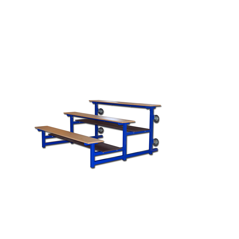 Для использования внутри помещений. Глубиной 2 м, с 3-мя ступенями и 12-тью цветными пропиленовыми сиденьями, которые установлены на стальную конструкцию в порошковой окраске (цвет можно подобрать), сборно-разборная с колесами для транспортировки. Производство EU.