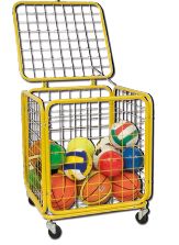 Изготовлена из стали в порошковой окраске, передвижная на колесах. Стенки крепятся болтами, оснащена замком. Габариты: 70x70x90 см, вместимость: 25/30 мячей. Производство EU.