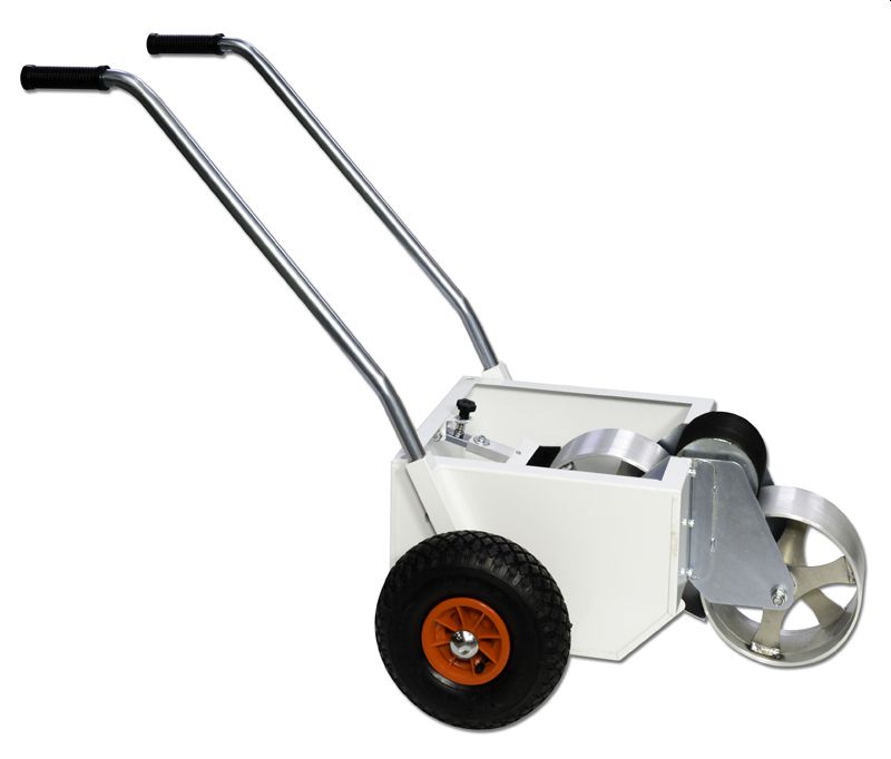 Использует экологическую краску. Конструкция из стали в порошковой окраске, передвижная на колесах. Направляющее колесо и устройство для регулировки толщины линии разметки. Производство EU.
